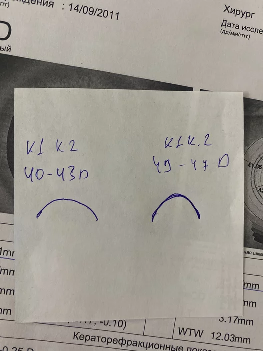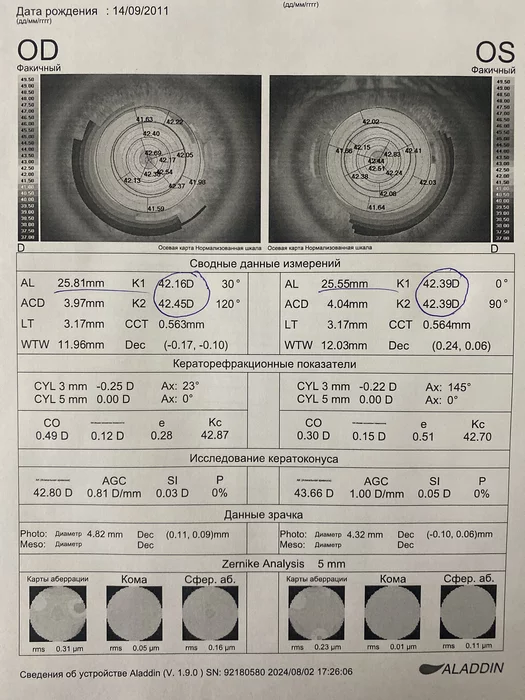 Глаза длиньше чем положено, но минус при этом не такой большой. На правом примерно минус 6-7 должно было на левом 5-6. А все потому что у него показатели роговицы K1 и K2 менее 42.5. Что говорит о более плоской роговице. Сила роговицы средняя около 44D. В то время как от 40 до 47 в принципе норма. Но более плоская роговица компенсирует ему минус. Была бы у него 45-46 (что значит более крутая) мы бы и получили те самые минус 5-6.