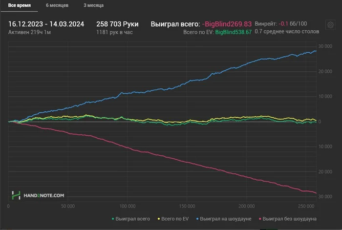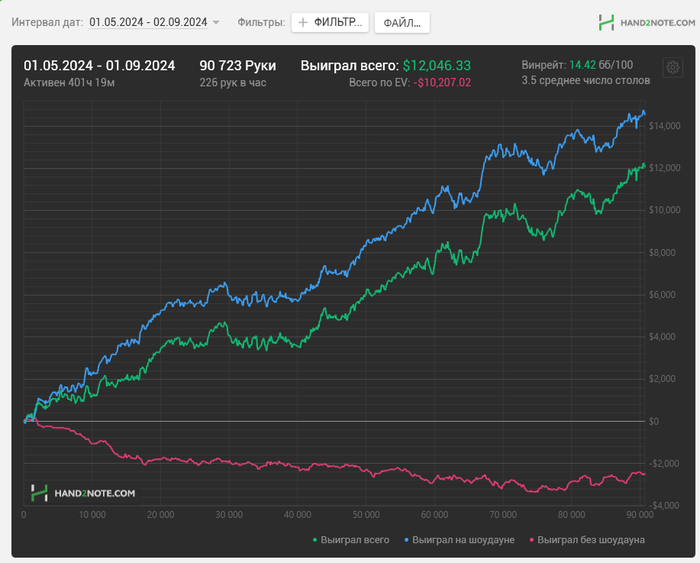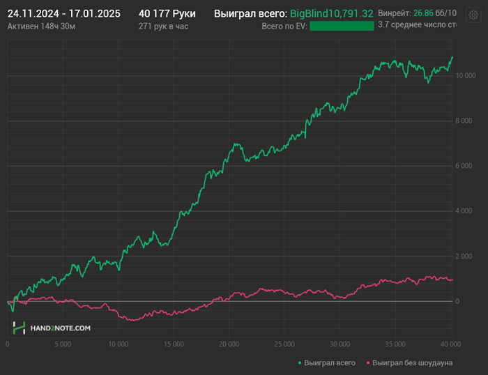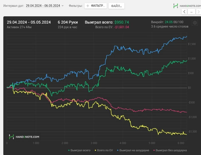 Пост для понимания, моего перебора по EV, я подключаю к игре крейзи ананас(там где на префлопе раздают 3 карты и одну карту сбрасывают после торгов на флопе) трекер считывает рандомные 2 карты из трех и в результате на графике EV показывается крайне не корректно. Ниже пример одной раздачи.