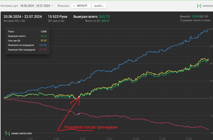 После бесплатного разбора базы, провели тренировку по префлопу и игре с фишами результаты на графики. Планирую ещё брать тренировки по мере возникновения новых вопросов. Однозначно рекомендую.