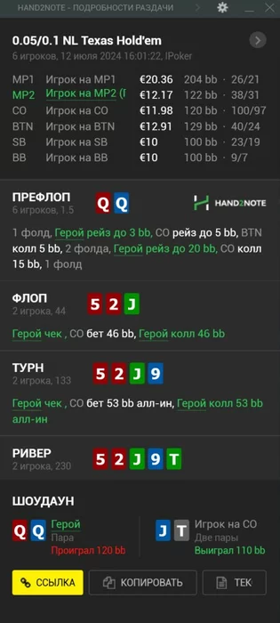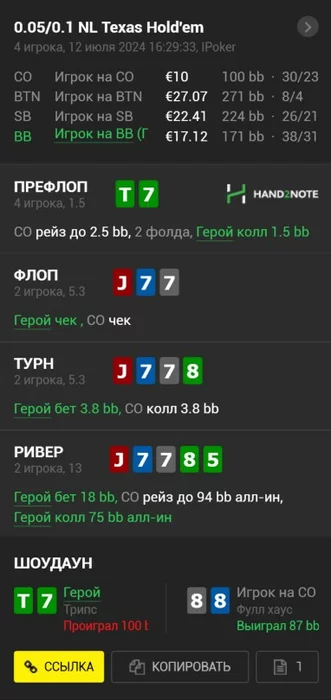 faerlook, Привет! Подписался, буду следить. У самого похожая история))) Только в проф покер ушёл в 44. По раздачам мысли такие. В первой против такого оппа чек пуш флоп самое то, вторая 2/3 пота ставка ривер и фолд на его пуш, ну третья наверное уже сам понял, что с такими руками как у тебя не пушат, мало эквити и часто попадём под доминацию. Зачастую то, что мы называем стриком, при переходе на новый лимит не что иное, как адаптация к новому стилю игры на нем ну и плюс наши пробелы в теории налицо. Удачи за столами! 🤝