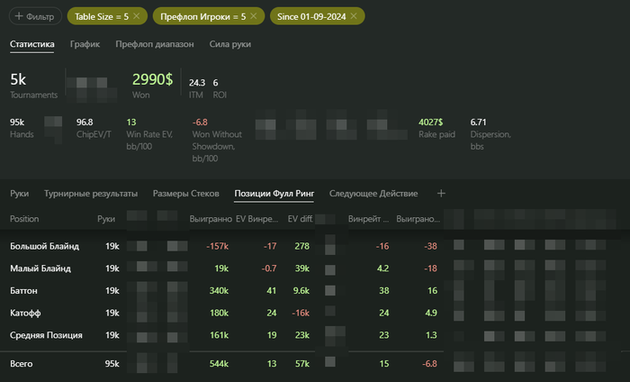 Результаты одного из учеников на 10том лимите. 5к турниров за месяц с 13евбб, почти 100ев фишек на первом столе и 7к+ денег с рейкбеком и лидербордами.