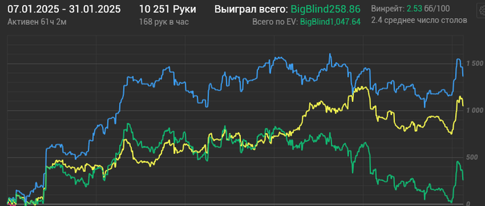 классное начало 25 года, вступил в green junior, объемы правда упали но это связано с майнингом и чуть с внешними обстоятельствами, наверное даже с применением тех знаний что дают не только по игре, регуляция клубов и тд, в целом стал посвящать теории гораздо больше времени, ну и собственно из-за этого игра хоть и меньше но увереннее, над чем и продолжу работать в феврале и все же добью 20к рук