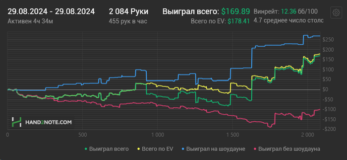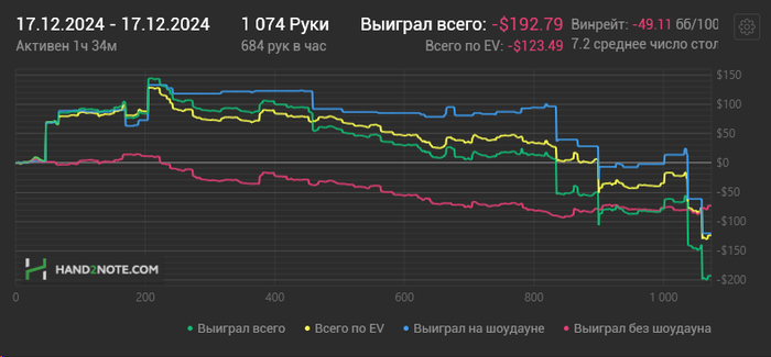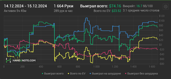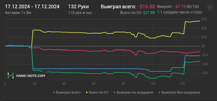 Думал играть сегодняшнюю сессию на максимальной концентрации, но не вышло из-за хоткеев. В каждой раздаче я только и думал, какую кнопку нужно правильно нажать, чтобы лишних денег не задонатить) Была раздача даже прикольная: чел на ривере ставит в меня, я с валет хай делаю рейз, но случайно вместо "повышение/ставка" нажимаю "чек/кол" - выигрываю 10 хай. Были миссклики и не в мою пользу) Короче говоря напряжная сессия, я хотел отыграть как вчера - часов 6, но у меня мозги чуть не взорвались после трех.. Но ничего, я с хоткеями играл на пс и 888 до переезда в Италию, и было очень круто, удобно и продуктивно. Сейчас привыкну и тоже буду радоваться!