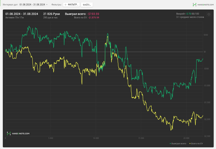 Первые 20к рук месяца синяя линия вообще ниже нуля была.