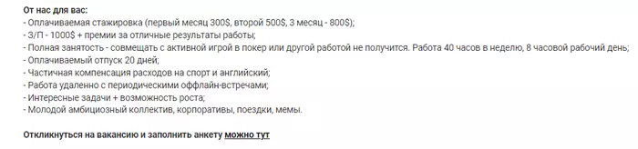 – Полная занятость - совмещать с активной игрой в покер или другой работой не получится. Работа 40 часов в неделю, 8 часовой рабочий день;