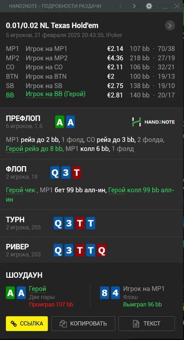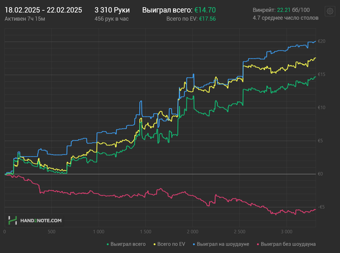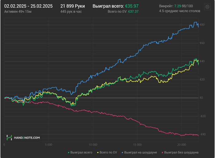 Отдельно хотелось бы отметить определенного рода достижение в том, чуть я весь этот год (с 08.01.25) играю один лимит, не прыгаю на лимиты выше, не залил свой микро банкролл ( типичная история , 😄). Именно ради этого и завел дневник, чтобы хоть как то себя дисциплинировать. Иногда бывает очень обидно проигрывать откровенным фишам, хоть и проигрываются копейки, но где то в глубине души что то цепляется.  Пока бр на отметке 150 евро, как и планировал отыгрываю до марта нл2 и буду пробовать нл4, думаю к концу февраля  уж наверное станет 40би для нл4)).