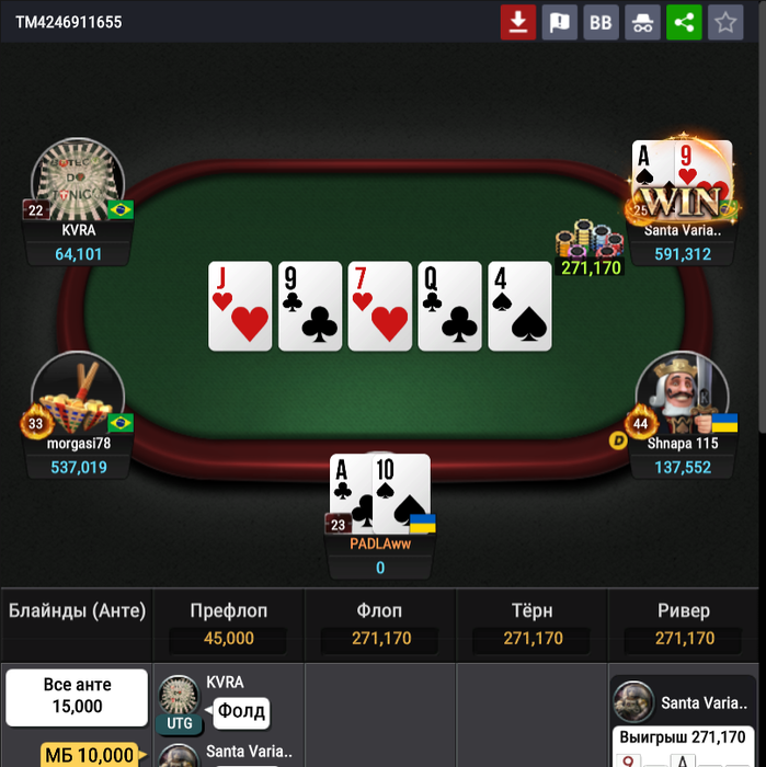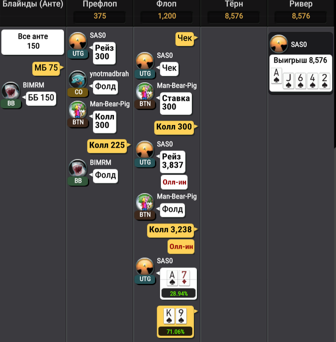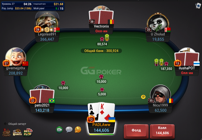 Регнул 4 стола Аби 10: С двумя попрощался сразу, а два ИТМнул. И сидел. Катал. Где-то подблефовывал. Где-то карту выжидал и с одним столом на пред финальной стадии случилось это: