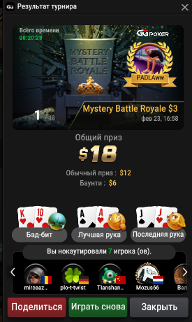 Вторая же сессия сегодня тоже закончилась 4 стола 1 итм, но вышел в + чуть за счет тех самых мистери. Ибо турики не пошли. В одном набил х40 стек. но это была к-Поляна поэтому всего лишь окуп всех столов. Надеюсь это действительно була крайняя партия парных мистери. Ну хотя бы в этом месяце: