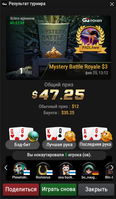 В турнирах минасанул где-то 50. Мистери +60. Чтоб вы понимали за сегодня ни одного золотого сундука. Последний МИСТЕРИ доигрывал параллельно. Три раза залетал в Алл-ин лоу-таба и никак не давался, по итогу вылетел 3м. Но решил досмотреть. Что вы думаете? -с него дропнулась 100ка 😭😭  Не знаю забинжены там сундуки под определенные акки или действительно все честно. Не понятно. Понятно одно - 0 золотых, но что-то плюсую. Играть дальше в это? - не понятно
