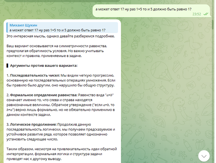 А Ваша 1=5 и поэтому 5=1...... это повторение ошибки в начале последовательности, но не решение заданной, нарастающей последовательности ошибок..)