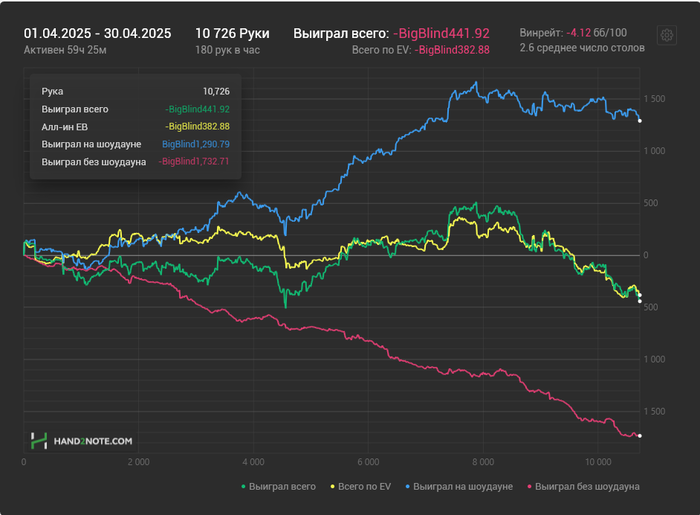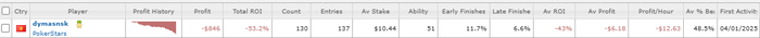 Понимаю, что дистанция небольшая всего 130 турниров и всего то 11к рук и тут возможно просто поворот дисперсии, но буду рад любым советам, что делать, заранее всем благодарен.