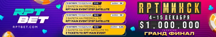💰💰 Завершает отборочную неделю к Гранд Финалу RPT 4-15 декабря в Минске очередной большой сателлит — сегодня будут разыграны минимум ЧЕТЫРЕ БИЛЕТА в RPT Main Event!