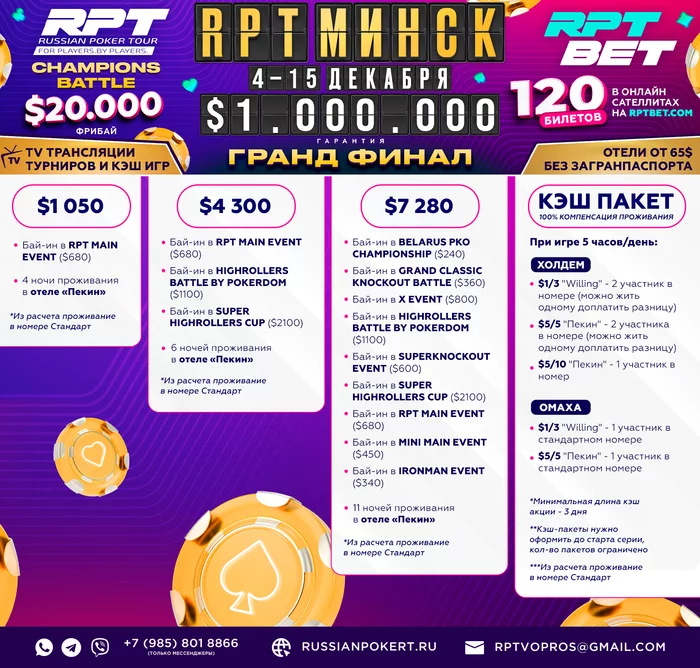 ПАКЕТ № 1️⃣ — $1,050 (Ознакомительный) ⠀ Обладатели этого пакета гарантируют себе 4 ночи проживания в номере Стандарт 5⭐️ отеля «Пекин», а также билет в RPT Main Event. ⠀ ПАКЕТ № 2️⃣— $4,300 (Хайроллерский) ⠀ В данном пакете предусмотрены участие в трех ключевых ивентах Гранд Финала — Main Event, Highrollers Battle и Super Highrollers Cup, а также 6 ночей в номере Стандарт 5⭐️ отеля «Пекин» c хорошим дисконтом. ⠀ ПАКЕТ № 3️⃣ — $7,280 (Максимальный) ⠀ Сверстан для настоящих гриндеров: практически все ключевые турниры из расписания + 11 ночей в номере Стандарт 5⭐️ отеля «Пекин» с приличным дисконтом! Клик мышкой — и вы обеспечиваете максимальную скидку на проживание. ⠀ 💰 КЭШ-ПАКЕТЫ по Холдему и Омахе (бесплатное проживание) ⠀ Как воздух для кэш-игроков! Гранд Финал всегда богат на отличный кэш, и любой кэшевик может получить бесплатное проживание в отеле, даже играя на лимите 1/3. ⠀ Для этого нужно минимально принимать участие в кэш-игре 3 дня, играя минимум по 5 часов/день. Полные условия для Холдема и Омахи на картинке с пакетами.