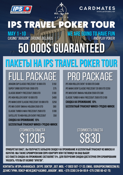 Афанасьев Игорь, организатор IPS, - doktop_007 (skype), +7 (903) 587-17-33 (мобильный), igor@pokermoscow.ru (почта) Гурин Денис, генеральный менеджер покерного клуба «Aragon» (http://casino-aragon.by/), +375 (336) 24-04-06 и +375 (298) 66-42-70 (мобильные). Ресепшн казино «Aragon», +375 (152) 74-74-77 и +375 (333) 54-54-77