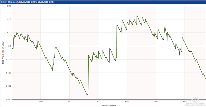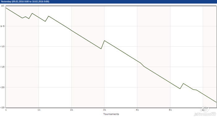 Так, пора написать как у меня дела :)) Меня или стрикует, или это в порядке вещей в турбо МТСНГ, мне не с кем посоветоваться, а следовательно я не знаю что с этим поделать, просто кину графики. график за вчерашнюю сессию. я не мог выиграть ровным счетом ни одного банка, не важно насколько впереди я на префлопе, и не важно что у чувака на 20 рук 80\60, именно против меня у него будут натсы XD график за этот месяц. у меня получается уже порядка 1000 МТСНГ сыграно в ноль\минус. разрыв между "выиграл" и "должен был выиграть" просто какой-то неприлично огромный. хотя, может так и должно быть?