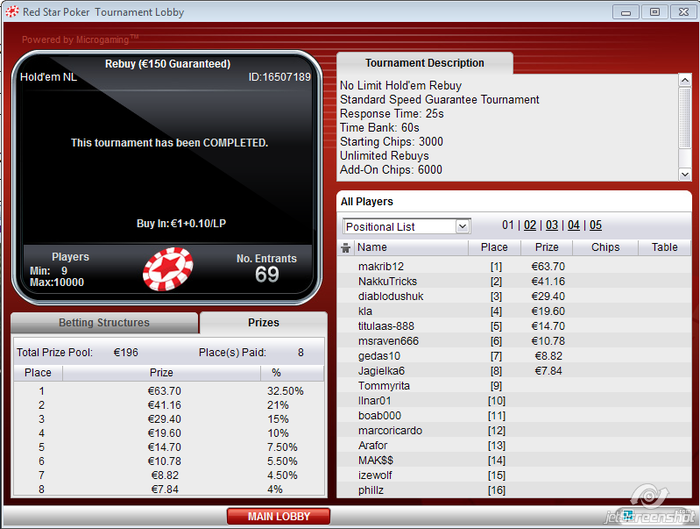 ладно, пилю кулстори для своей братвы! если вкратце, то не писал отчетов просто потому что хотел какой-нибудь крупный занос (200$+), тогда можно было бы и похвастаться здесь, но как-то так вышло, что выигрывал я только мелкие призы типа 30-80$, о которых и писать то и не хочется, хоть это и первое место в некоторых турнирах :))