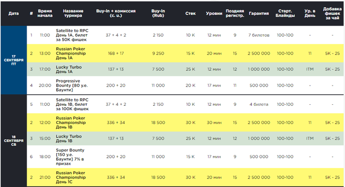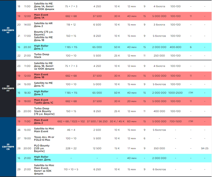 Игроков ждёт уже устаканившееся расписание со всеми привычными турнирами, посмотреть его вы можете чуть ниже. Все ключевые и любимые турниры сохранили своё место в общем ростере: будет и Russian Poker Championship, и Altai Poker Cup, и турнир хайроллеров, и мейн ивент - куда же без него.