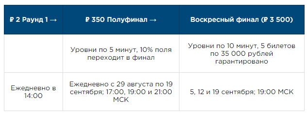 Не успеваете сыграть сегодня? Не беда, финальные сателлиты пройдут ещё 12 и 19 сентября, тоже с бай-ином 3 500 рублей и гарантией в 4 билета на мейн в каждом.