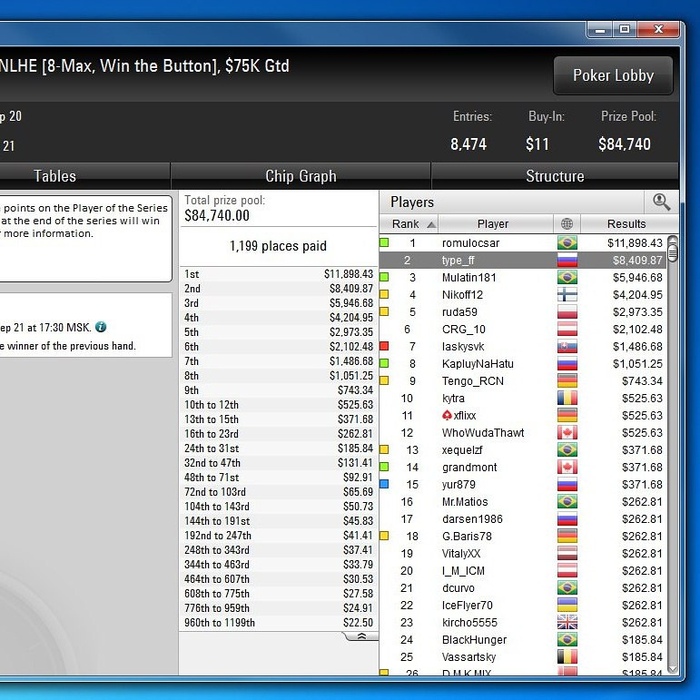 Я перебрался в более крупные румы, аби и афс подросли, но ап не думал заканчиваться. На протяжении полугода я каждый месяц стабильно выносил 800$+, играя при этом по 150-200 турниров в месяц на аби8. Спустя полгода безболезненной катушки я сажусь полудить завершающие дни серий. Турниров на мой аби было крайне мало, в скупе на ПС я нахожу ВИН ЗЕ БАТТОН за 11$. Такой формат был для меня в новинку, но выбирать не пришлось, остальные турниры были в категории 55$+. Помимо этой двухдневной лудильни на 8000 человек я подгружаю серийник на редстаре в низком афс за 30 евро. День складывается так же как и последние полгода, на редстаре я оформляю 2 место с призовыми 1500 евро, а на ПС прохожу во второй день.