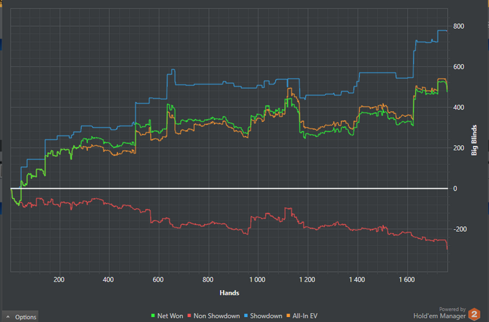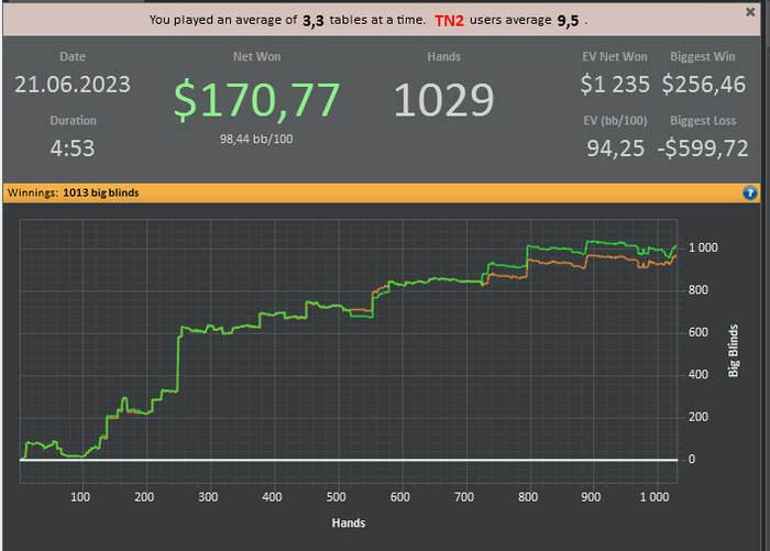 Поспал пару часов днём, вечером внезапно были неплохие столы, покатал еще немного. Радует, что делать это не в напряг, местами даже интересно. Последнее время игра в покер воспринималась как унылое рутинное действо, уже через час я скатывался в автопилот. Всегда завидовал людям, которые получают от игры удовольствие. Наверное это и есть счастье - гореть тем делом, которое приносит тебе деньги. Едва ли я смогу разбудить в себе страсть к игре, но если я смогу откатывать эти 1-2к рук в день с каким то энтузиазмом - я буду очень доволен.