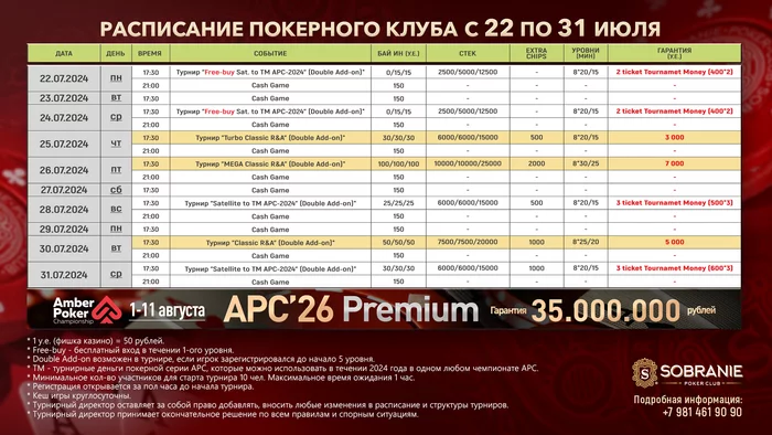 На предстоящей серии APC-26 стоимость участия в Main Event, который пройдёт с 8 по 11 августа, составит 700 у. е. = 35 000 рублей.