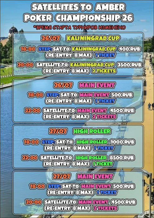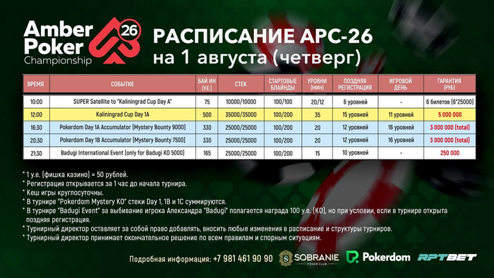 Завтра стартует очередная покерная серия в Калининграде АРС-26, которая пройдет с 1-11 августа в самый разгар лета! Только вот не знаю будет ли у вас время насладиться местными красотами и достопримечательностями, потому что мы подготовили для вас классное расписание с разнообразными турнирами.