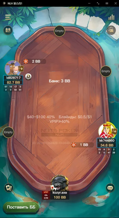 Как и было озвучено ранее, хочу заценить вам милую и приветливую полянку на NUTS POKER. Увы, запечатлеть на скринах самые мелкие лимиты (нл2-10) не удалось, т.к. о контенте для блога задумался немногим позже, чем начал свой путь от 40$ до 5000$ в рамках стримов. Но вот от игры на нл20-50 пока что балдеть не перестаю.