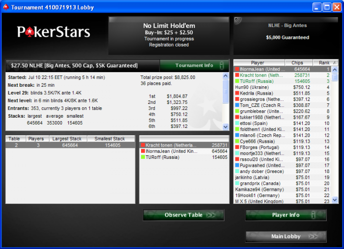 За последнюю неделю был только один серьезный занос - 4 место (750$) в 27.50$ Big Antes. Не складывалось в оллинах в предфинальной стадии, примерно раз 5 вылетал в ТОП-20 (поля 1к+), был в ТОП-45 The Big 11 (вырубился инет, потерял полстека).