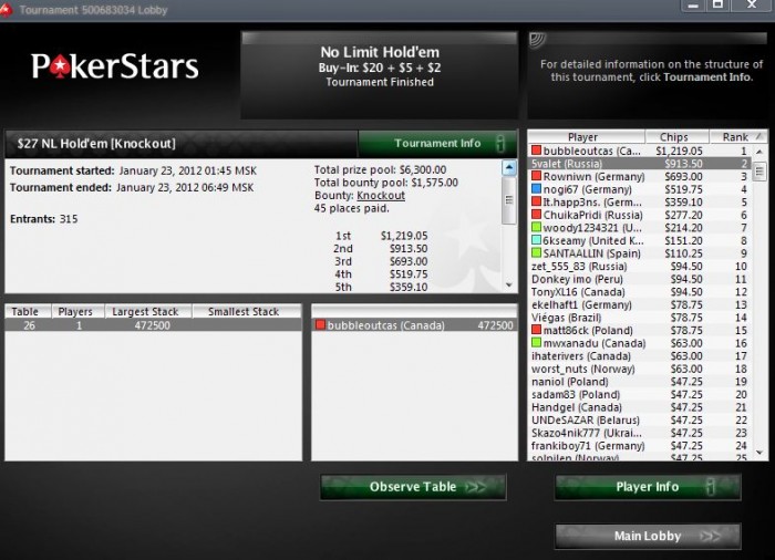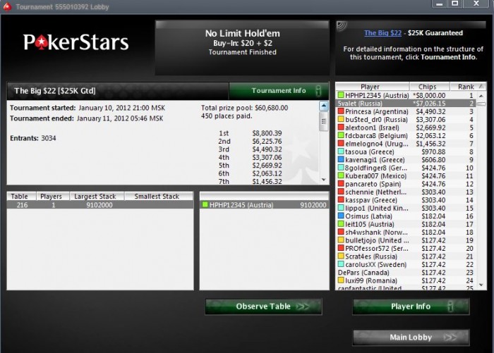 Я очень много времени топтался на лимитах 3$-11$. Продавал доли на форуме и пытался выстрелить в турнирах 22$-55$. Но все как то не складывалось. В сентябре я начал играть от ТайнерПокерТим. Соответственно изменился и подход к покеру. Дисциплина, тренировки и работа над собой. Но и играя от команды я долго топтался на одном месте , пытаясь устранить лики в своей игре и перейти на следующий уровень! И вот наступил 2012 год. Начало было приятное: Ну а сегодня случился мой самый большой занос на сегодняшний день, что и дало возможность попробывать закрепиться на средних лимитах! Надеюсь эта попытка будет удачной и я смогу бить эти поля. И тем самым буду готовить себя для игры на более высоком уровне! Ну что ж удачи мне! Здесь я постараюсь отписываться о том как проходят мои игровые сессии, выкладывать спорные и интересные раздачи, и просто общаться с читателями данного раздела!