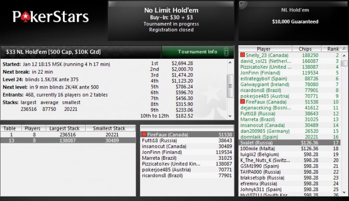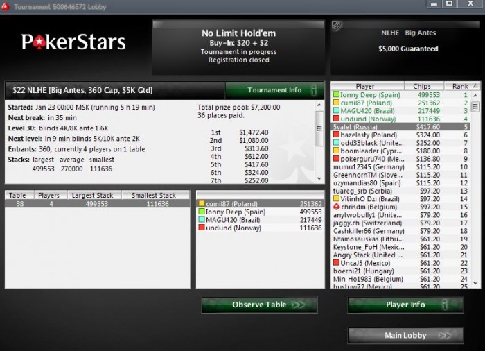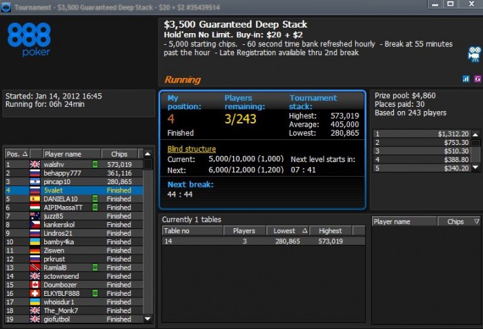 Всем доброго времени суток! Вкатываюсь по-тихоньку в новые для меня лимиты! Сессия в принципе складывалась неплохо, если бы не то, как она закончилась. Но обо всем по порядку! Начало было обычным, пара аутов из первых туриков и подгружаем далее. 2 дип прохода закончились предфиналкой в кепке(17 место 99<TT) за 33$ на ПС и финалкой(9место A5<AJ СБ в ББ) в Дипстеке на 888. параллельно подгружал еще турниры, и в итоге одновременно шел неплохо сразу в трех турнирах: ПС 8.80$ - 16K$ GTD (TheBig) - аут 109 место. JJ<AK. 888 24$ - 2.5K$ GTD - аут 16 место. и самая обидная предфиналка 888 3.50$+R - 4K$ GTD - аут 18 место. AK<KJ СБ против Баттона за чиплидерский стек!
