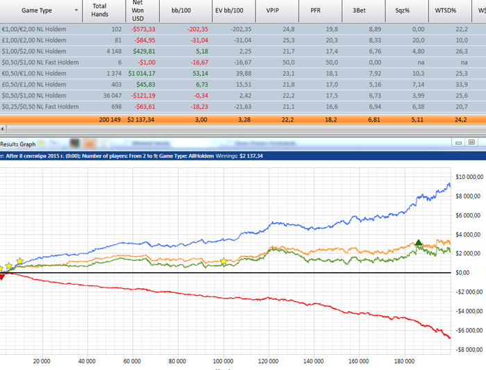Привет всем, брал курс групповых тренировок от 8 сентября. Перед этим занимался с 2 тренерами, около 40% того, что мы проходили мне было известно в том или ином виде. Тем не менее, я получил много полезной информации для размышления. Огромный плюс Андрея - человек отвечает на любые возникшие вопросы(даже если они не относятся конкретно к теме тренировок или требуют глубокого анализа). На всё, что меня интересовало, я получал исчерпывающий ответ. Тренер позитивный, общительный, заинтересован в том, чтобы ученики усвоили материал. Нет никаких недомолвок, все разбирается по полочкам. график с нл25-200 с начала тренировок(довольно много рук сыграно в неоптимальном состоянии, играю 12 столов сх+фр)