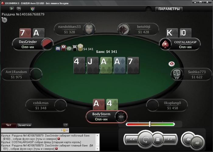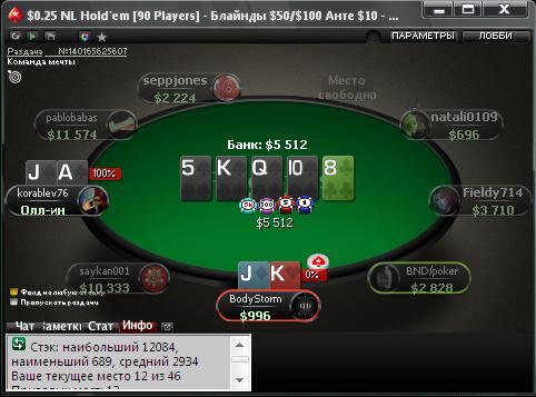 я вчера тоже грузанул фриху на 777$ пересидел кучу народу вылетел за 50 мест до итм AQ<33 префлолп аллин, часа 3 сидел и впустую, решил больше их не играть))) на 888покер щас фрихи идут неплохие по билетам, и в итм несложно попасть, я в них около 20$ за 2 дня набрал, а вчера в командном туре за 1бакс до 4го места дошагал http://clip2net.com/s/3nmEVOT это в итоге за 4 игровых дня получилось с 0$ самое интересное что вывести не могу))) депозитов еще не делал