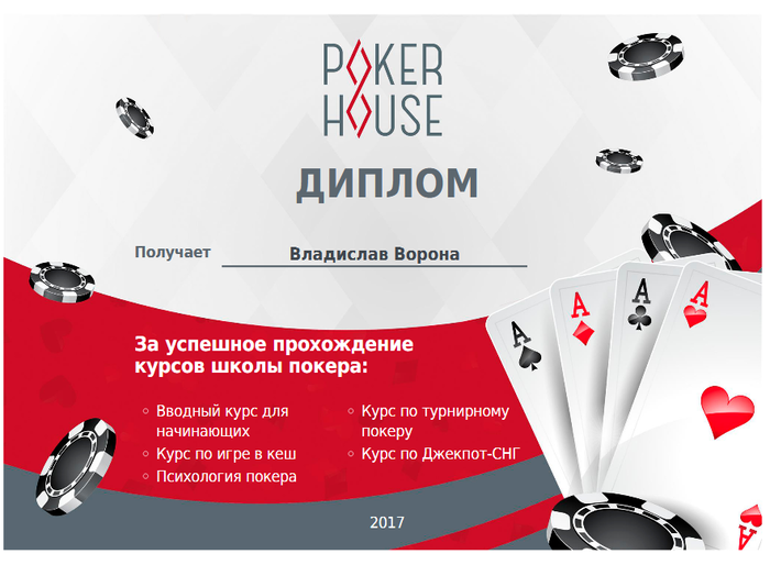 ну охренительный диплом, что сказать.. Теперь меня точно возьмут в команду покерстарз про Зачем только писать, что "по окончанию курса вы получаете диплом школы", я таких дипломов могу наделать себе сам)
