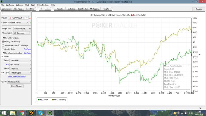 SB: 154.46 BB (VPIP: 47.06, PFR: 41.18, 3Bet Preflop: 0.00, Hands: 17)