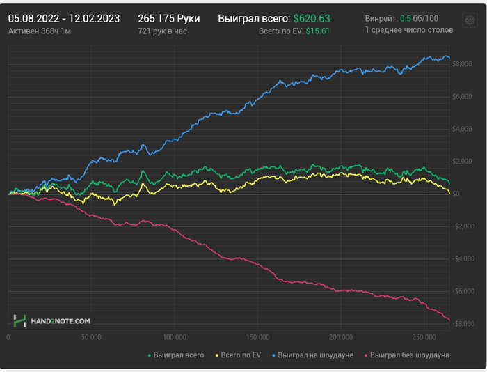 Однако все оказалось несколько сложнее, и уже в феврале месяце план по покорению PokerKing был свернут . Формальной причиной стал тот факт, что после 265 000 сыгранных раздач EV Profit подобрался к отметке "ноль", после чего я сильно усомнился в целесообразности усилий его оттуда снова поднимать 🙀.