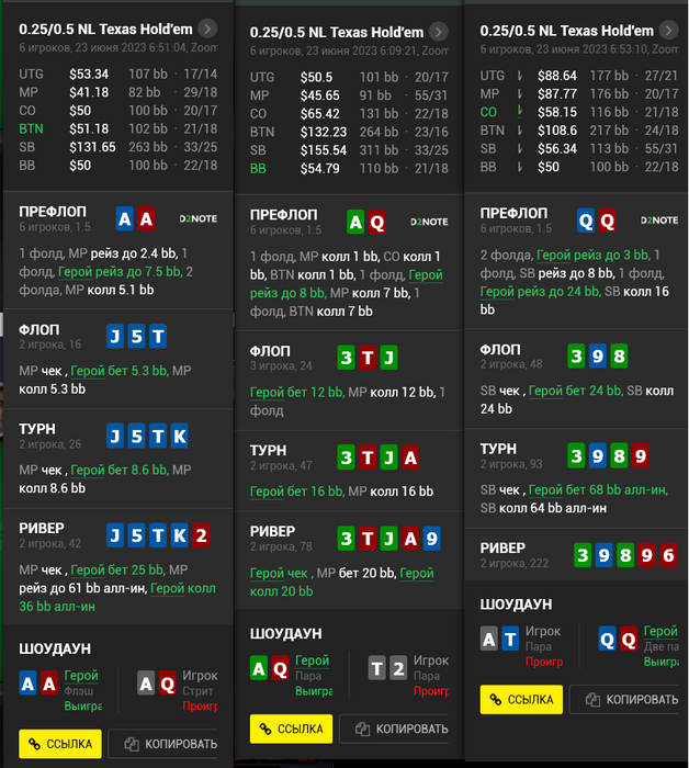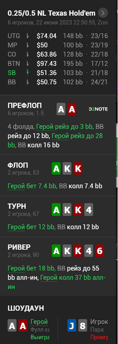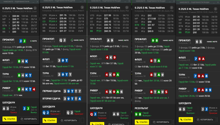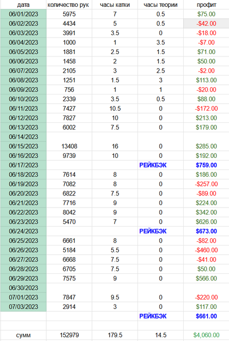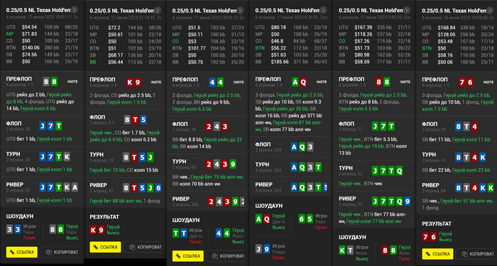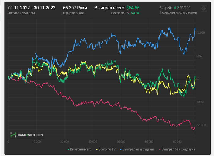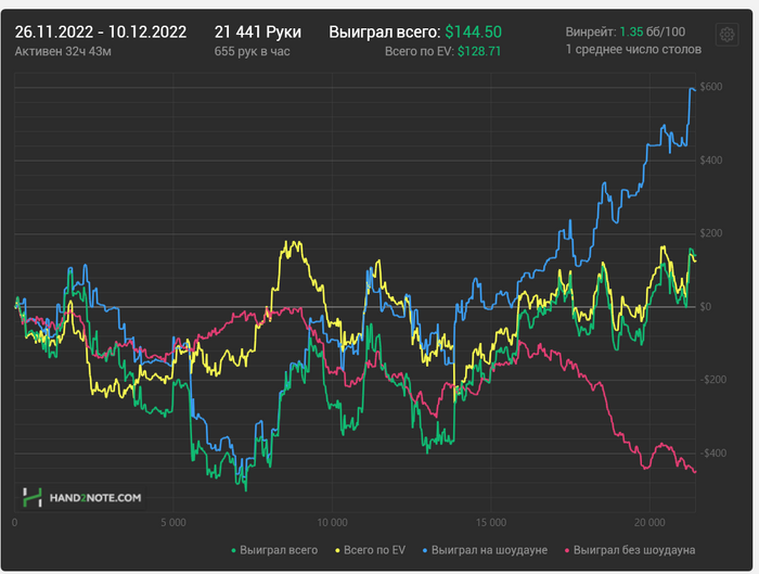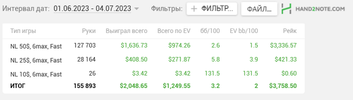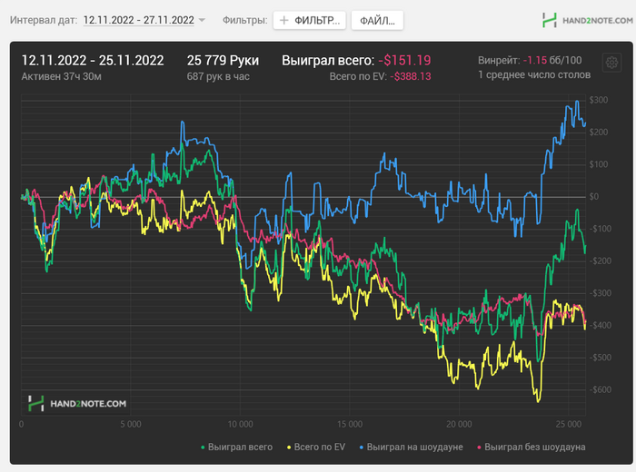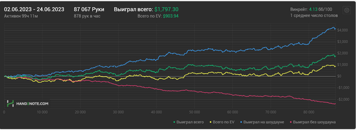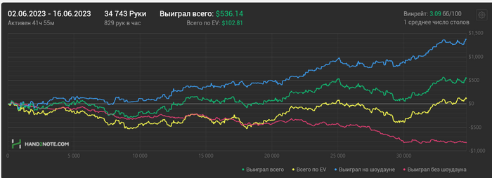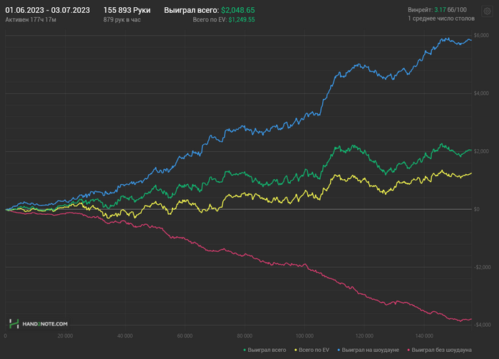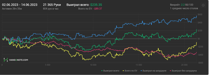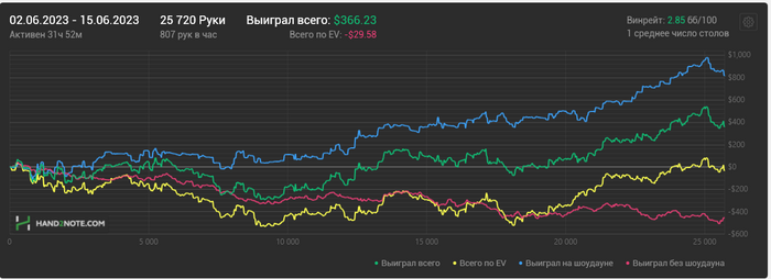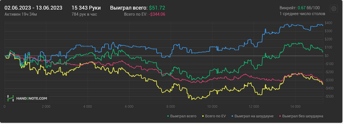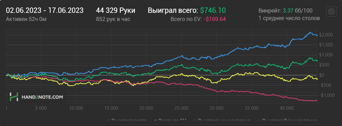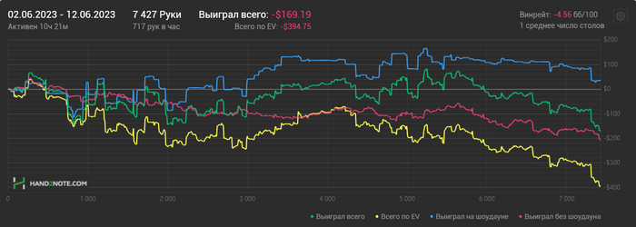 Очень плотная катка получилась, и в плане объема и в смысле раздач. Радует, что скорее всего неделька будет в плюсе не только по рейкбеку (тьфу-тьфу-тьфу). В процессе игры в результаты вообще не захожу, проверяю только после окончания сессии. Любопытно, что в некоторых сессиях красная прямо жестко сыплется вниз, а в некоторых идет более-менее около ноля, хотя по сути никакой разницы в стратегии и принимаемых решениях я у себя не замечаю, видимо просто по-разному сдают, совсем без попаданий ведь не навоюешь :(