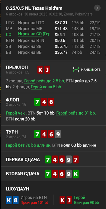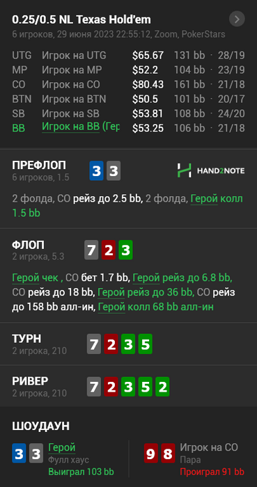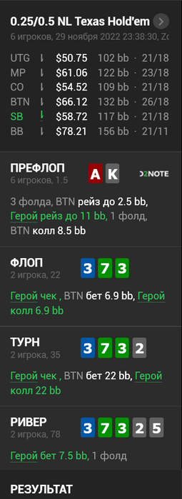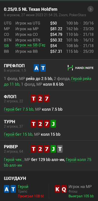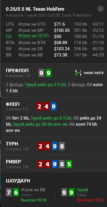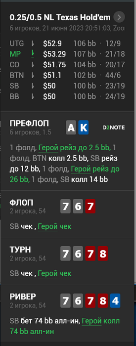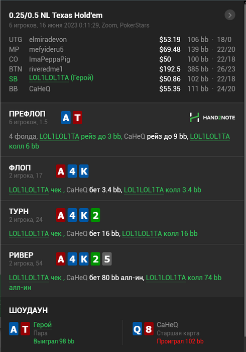 По ощущениям, получился денек, было много раздач с фишами, и ГСЧ был в целом благосклонен, хотя и не без подстав :) За катку толком сел аж к 10 вечера и промотался до 7 утра, с перерывами на покушать и на чай. Чем нравится зум, так это отсутствием необходимости играть в глубоких стеках: перезапускаю стол когда 120bb+ становится и вообще не парюсь за усложненные споты 😎 Всё-таки игра на рейкбек это игра на рейкбек, на звание покерного светоча я ни разу не претендую, претендую на звание неплохо зарабатывающего парня