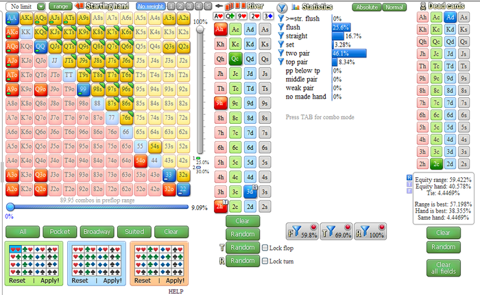 я вообще почему спрашивал про диапазон просто на скрине из флоп зиллы я бы убрал пару рук поскольку не думаю что он бы играл чек на страшной доске к примеру с или