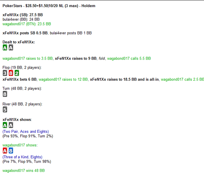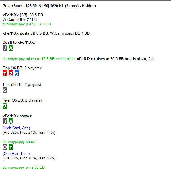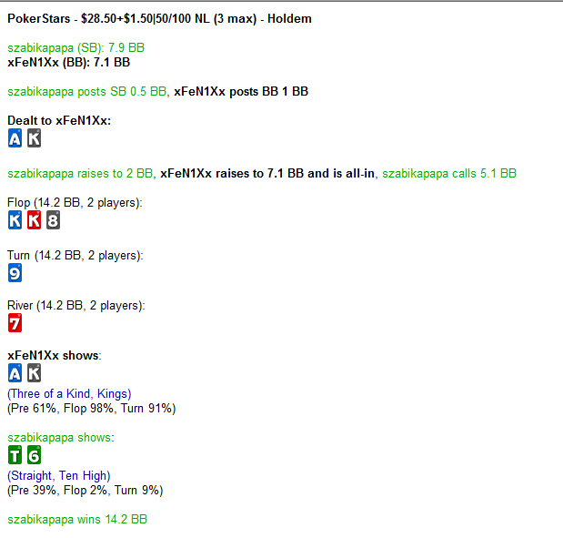 но чаще просто все флипы мимо или кулера. Причем мне очень везло с составами, больше 50% турниров отыграл против хромов/золота, на местных акул 30ок вообще почти не попадал, человек 5-6 от силы встретил таких, в основном либо везло на совсем случайных людей либо на знакомых по 15кам регов. Еще вдруг откуда-то появилось много народу из Израиля (категория хром/золото), на 15ках я их вообще почти не помню. В общем, если бы меня на 30ках встретила толпа регов и я бы им все в одну калитку проиграл - было бы даже не так паскудно, они ведь, правда, скиловее. Но когда у меня почти за каждым новым столом попадались люди, играющие примерно вот так: