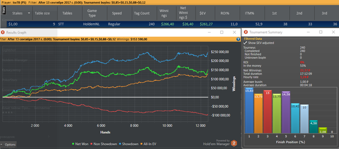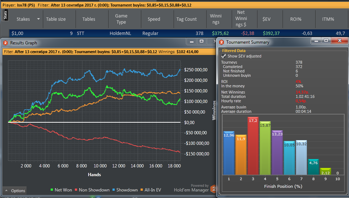395 игр))). Начал сессию и сразу же кончил. Продолжает стриковать не подеЦки. 10,6К рук ничего не могу вытянуть по ШД на пуш-фолде. Просадка в 45 би это уже перебор, для этого лимита 25 норма, ну 30 максимум епт, 45 это уже жесткий стрик идет и походу тянет еще вниз, если упаду до 70-80 би для меня это будет просто загадка или как мой брат говорит магия покера))). Начинаю уже тильтовать потихоньку. Сегодня сделаю выходной - покатаюсь на велике километров 50-т))) пока тепло.