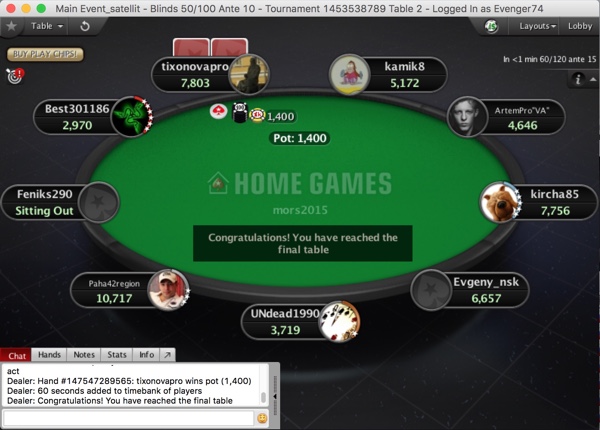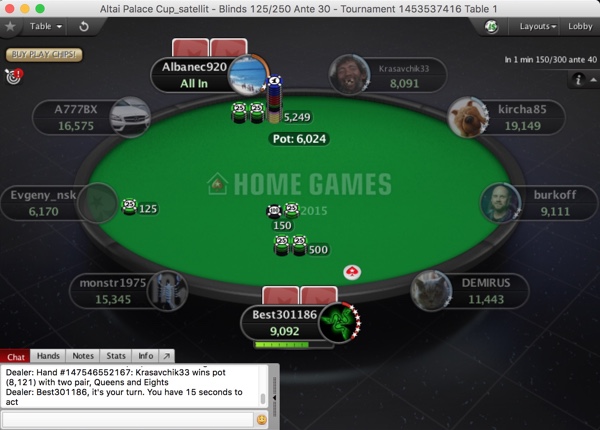 По вашей просьбе, хотел бы немного поделиться впечатлениями об игре. В целом играть на Home Games довольно приятно, со многими играл на SPT серии на Алтае, с некоторыми и в Новосибирске была сыграна не одна тысяча рук. Состав игроков совсем разный, от новичков до постоянных игроков на PS. Единственное, что касается онлайна, это отсутствие статистики за столами на условные уже совсем не могу играть, когда нет этих цифр перед глазами. Из-за этого пришлось, не катать привычную сессию на старзах и уменьшить количество турниров, чтоб хоть как-то успевать смотреть за тем, что происходит за столом