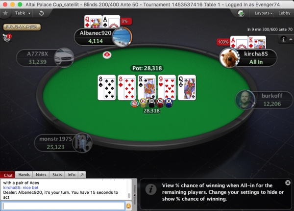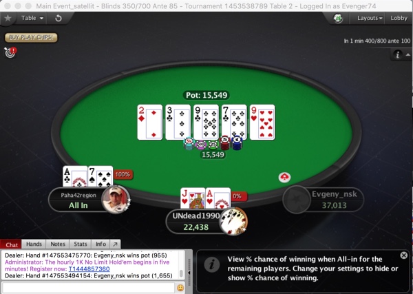 Ну а за соседним столом бесчинствовал новичок - "A777BX". Для Алексея Хоботова все началось с маленькой победы над "Kemkin95", когда он собрал натс-флеш, и получил оплату (начало конца для Антона; вскоре он попал с против и вылетел), после чего новосибирец начал брать банк за банком!