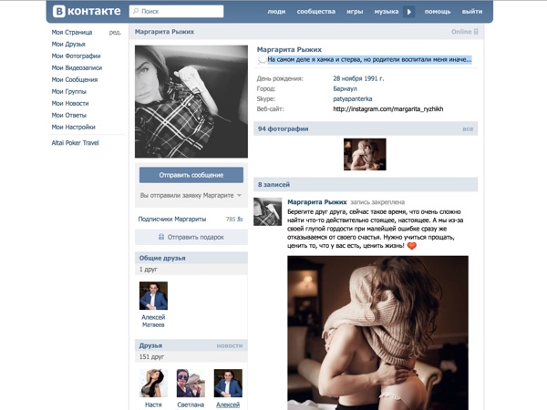 Первой свела с ума своих соперников Маргарита Рыжих, играющая под общевозбуждающим ником "SoulPantera". Совершенно уверен, на изучение ее персональной страницы вКонтакте ими было потрачено немало времени. Со вступительной строчки: "На самом деле я хамка и стерва, но родители воспитали меня иначе".