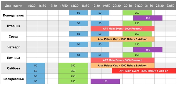 «Шаг 1». NL Hold'em. Бай-ин - 50 руб. Стек - 1,500. Уровни - 5 мин. Ребай неограничен, эдон после 6 уровня. Призы - билет на «Шаг 2», сдача - баббл-бою* «Шаг 2». NL Hold'em. Бай-ин - 250 руб. Стек - 2,000. Уровни - 5 мин. Ребай неограничен, эдон после 6 уровня. Призы - билет на «Шаг 3»**, сдача - баббл-бою «Шаг 2+». PL Omaha. Бай-ин - 150 руб. Стек - 2,000. Уровни - 5 мин. Ребай неограничен, эдон после 6 уровня. Призы - билет на «Шаг 3»***, сдача - баббл-бою «Шаг 3». NL Hold'em. Бай-ин - 1000 руб. Стек - 2,000. Уровни - 10 мин. Два ребая, эдон после 6 уровня. Призы - билет на Altai Palace Cup (10К), сдача - баббл-бою «Шаг 4». NL Hold'em. Бай-ин - 3000 руб. Стек - 3,000. Уровни - 10 мин. Два ребая, эдон после 6 уровня. Призы - билет на APT Main Event (30К), сдача - баббл-бою