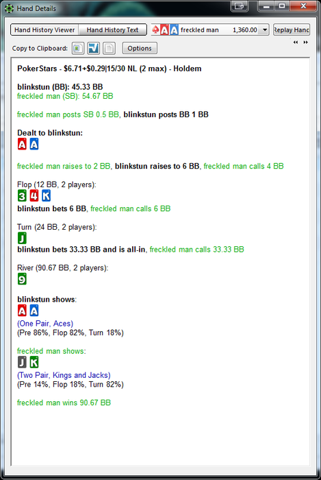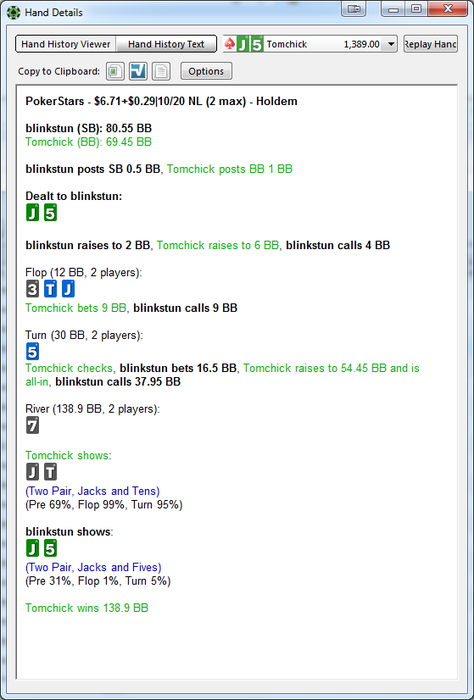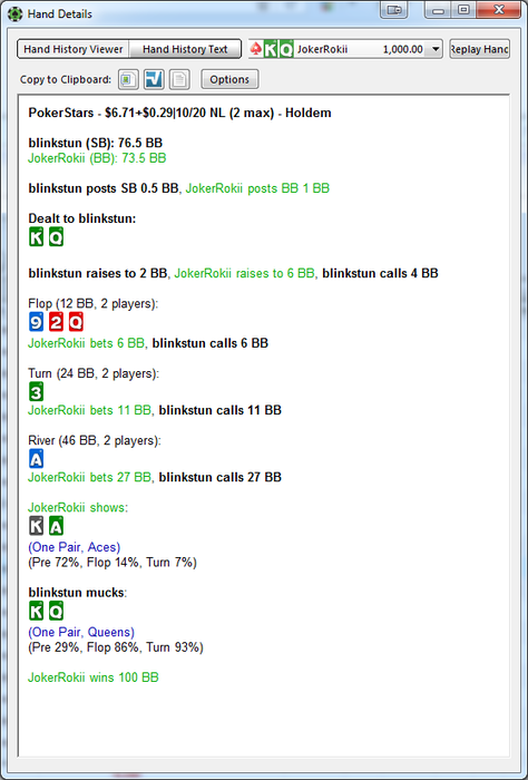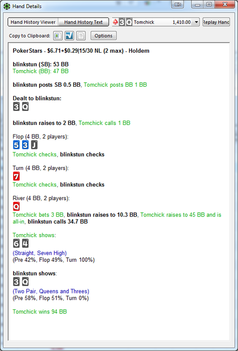 Комментарий: в глаза сразу бросается перебор по ЕВ, но он произошел в 2-ух ХА, в первом я бедбитнул по 14% челика, но он начал тянуть все выставления и на равных стеках раздали кулер, так что все равно лузанул, и еще один раз бедбитнул кого-то уже не помню как. А самого по ЕВ не ебнули, потому что добирал на терне далеко впереди, а на ривере уже выставлялся против еллоу боя. Могу раздачи покидать. Но суть не в этом. Суть в том, что зачем-то опять начал зарубаться с регами. День мог выйти в нормальный плюс, но по итогу проиграл 4-5 лишних ха. Грусть-тоска. Попробую больше к регам не садиться, а против глориустито, который по кд меня ситит, буду вырабатывать стратегию. В целом, то что день в плюс, уже само по себе заебись. А теперь, все на футбол!