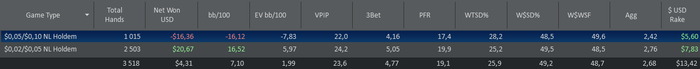 Start Bankroll 617,94$; Stop Banrkoll 636,32$; Cтолов 6; Мини сессий 6; Рук: 3518; Время = 360 мин; Результат = 4,31$ (+10RB); bb/100 = 7,10; Моя оценка = 5 c 10. Цель на день Net Won(24$) выполнена на 17,9%; Цель на день Hands (3400) выполнена на 103,4% Цель Руки на пятый игровой отрезок за все дни (333К) выполнена на 12,9% (43084 рук); Цель NW & RB на пятый игровой отрезок за все дни NW (2000$) выполнена на -3,6% (-73,50$), RB (200$) выполнена на 25% (50$); Comment: День не очень, играл слабо, но даун продолжается по сути и все время на NL10. Завтра 2 стола продолжаю попробую зацепиться и уже подниматься выше.