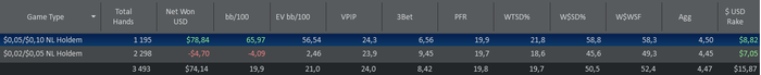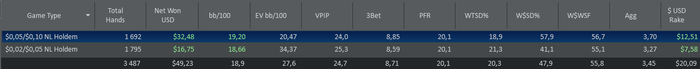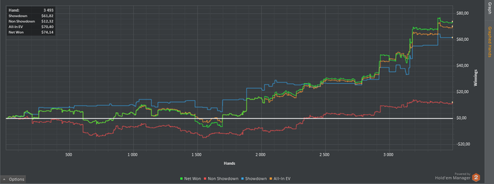 Start Bankroll 636,32$; Stop Banrkoll 710,08$; Cтолов 6; Мини сессий 6; Рук: 3493; Время = 360 мин; Результат = 74,14$ ; bb/100 = 19,9; Моя оценка = 6 с 10. Цель на день Net Won(24$) выполнена на 308,9%; Цель на день Hands (3400) выполнена на 102,7% Цель Руки на пятый игровой отрезок за все дни (333К) выполнена на 13,9% (46577 рук); Цель NW & RB на пятый игровой отрезок за все дни NW (2000$) выполнена на 0,03% (0,64$), RB (200$) выполнена на 25% (50$); Comment: Апнуло, но игрой доволен, одна грубая ошибка и море мелких.