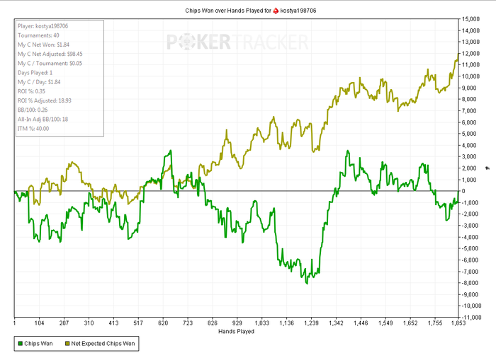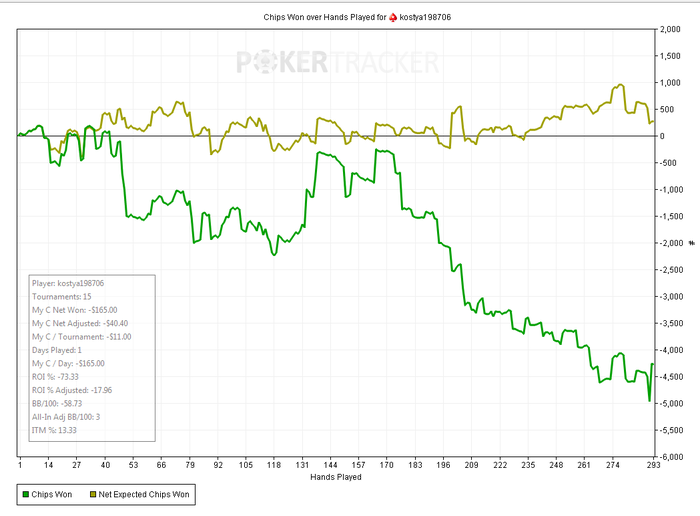 а нефиг было на лимите 15 катать, имея за спиной 50 баинов, при таком банкроле максимум "тройки", да 15 турниров не показатель...:) я за день под 300 спинов отыгрываю, хотя знаю некоторые по 4-6 столов и под 1000 туров в день откатывают :)