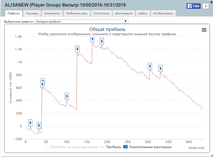 Ну, что пора подводить итоги замазки. В общем картина прямо скажем не радостная. Прибыль составила чуть более 269 $. хотя до 17/10 шел в ++ 1300 $.Но последние 10 дней ак отрезало, попросту лудил , а не играл. Какое-то неизбежное состояние тильта, безысходное и гнетущее настроение преследовало меня вторую половину месяца. Дистанцию прошел всю, даже больше чем 400 турниров, но вот результат просто ужасный.