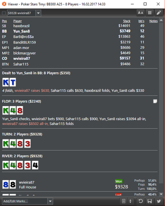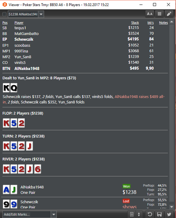 Yun_San8, в таких стеках выкинула бы в пас, даже если запушить в лага не факт что он выкинет свои какие-нибудь А7о (если не брать во внимание исход ситуации), а стек его в 3 раза больше и это примерно начало турнира на сколько я понимаю. Невыгодно слишком рисковать.
